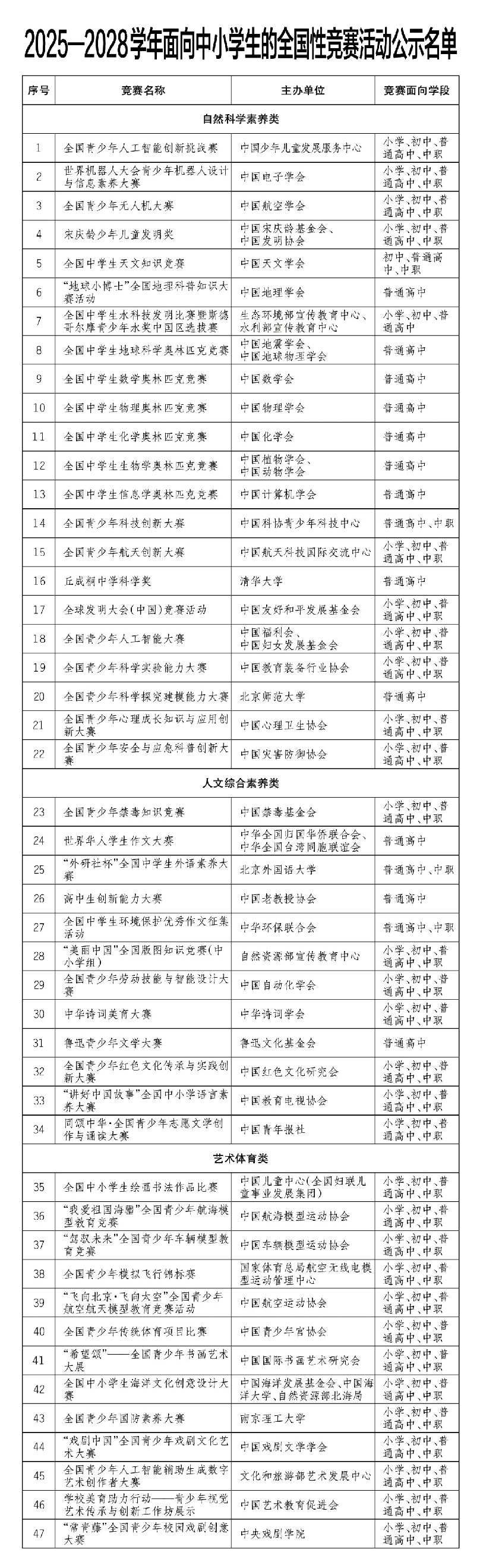 近日,教育部发布公示,拟确定全国青少年人工智能创新挑战赛等47项竞赛为2025—2028学年面向中小学生开展的全国性竞赛活动,即日起至9月17日进行公示。本次公示的名单中,自然科学素养类竞赛活动包括全国青少年人工智能创新挑战赛、世界机器人大会青少年机器人设计与信息素养大赛、全国青少年无人机大赛、宋庆龄少年儿童发明奖等22项;人文综合素养类竞赛活动包括全国青少年禁毒知识竞赛、世界华人学生作文大赛、“外研社杯”全国中学生外语素养大赛、高中生创新能力大赛等12项;艺术体育类包括全国中小学生绘画书法作品比赛、“我爱祖国海疆”全国青少年航海模型教育竞赛、“驾驭未来”全国青少年车辆模型教育竞赛、“飞向北京·飞向太空”全国青少年航空航天模型教育竞赛活动等13项。教育部要求,2025—2028学年面向中小学生开展的全国性竞赛活动举办时间原则上为2025年9月至2028年8月,在此期间每学年举办不得超过1次,累计不超过3次。