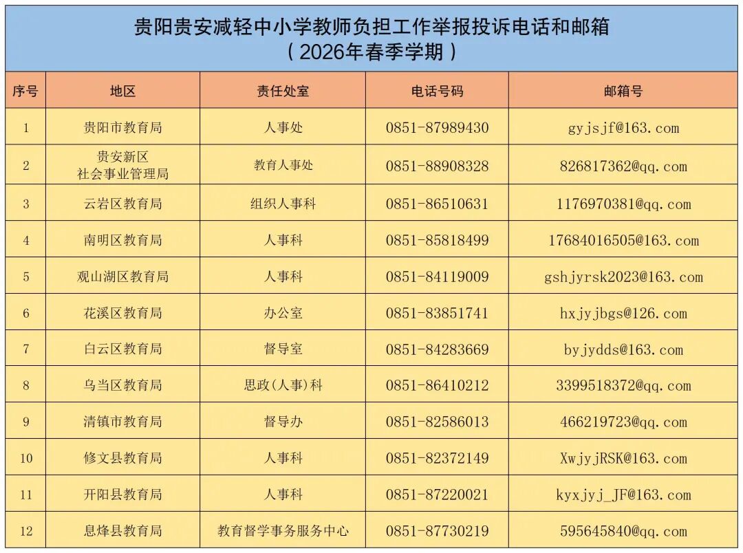 为切实减轻中小学教师负担,进一步营造良好的教育教学环境,市教育局面向社会公开2026年贵阳贵安减轻中小学教师负担工作举报投诉电话和邮箱,接受广大群众监督,一起来看——