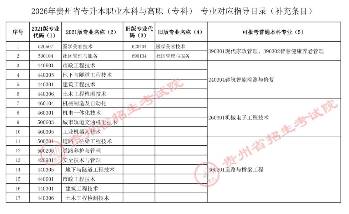 根据《教育部办公厅关于公布2026年本科层次职业教育专业设置备案结果的通知》(教职成厅函〔2026〕5号),贵州省交通职业大学2026年本科层次职业教育专业设置备案工作已完成,从2026年起开始进行专升本招生。结合我省2026年专升本考试招生报名情况,现将2026年贵州省专升本专业对应指导目录补充条目公布如下: