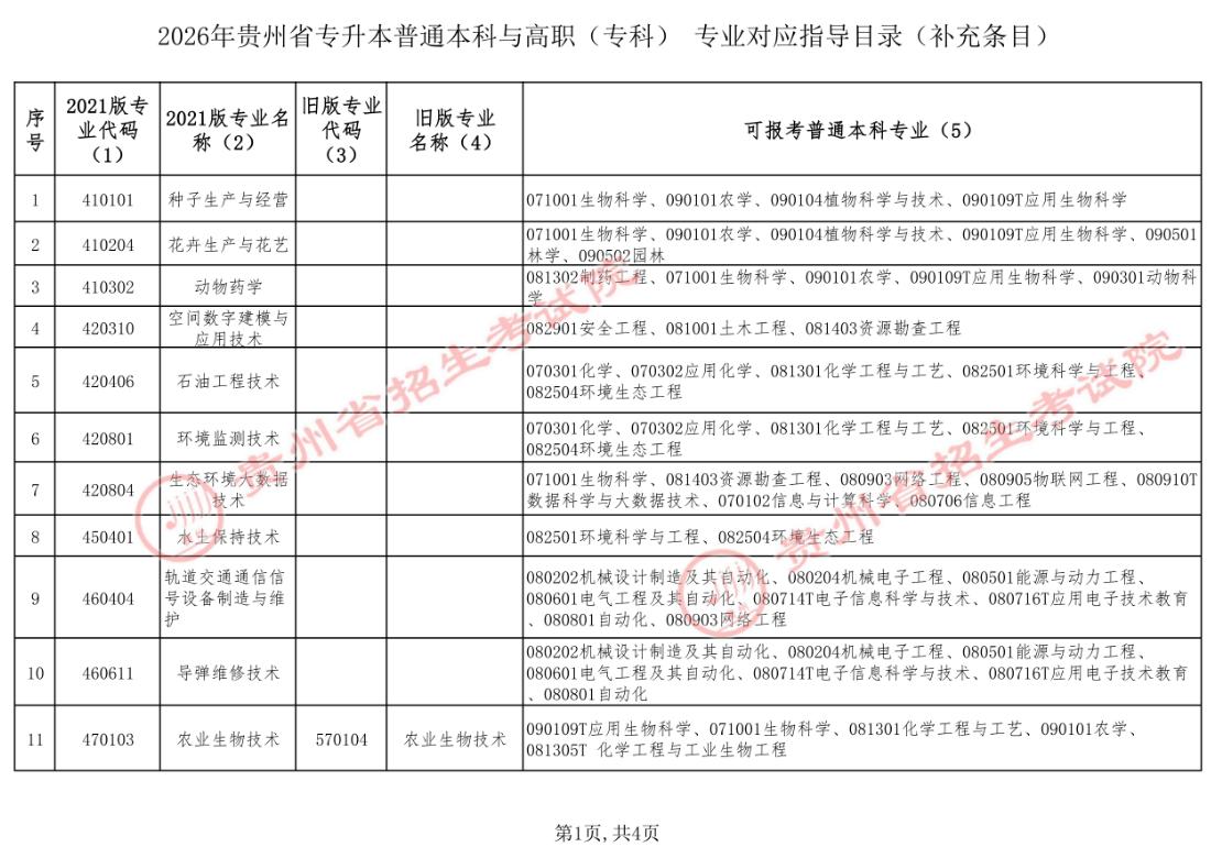 省招生考试院关于公布2026年贵州省专升本专业对应指导目录补充条目的通告